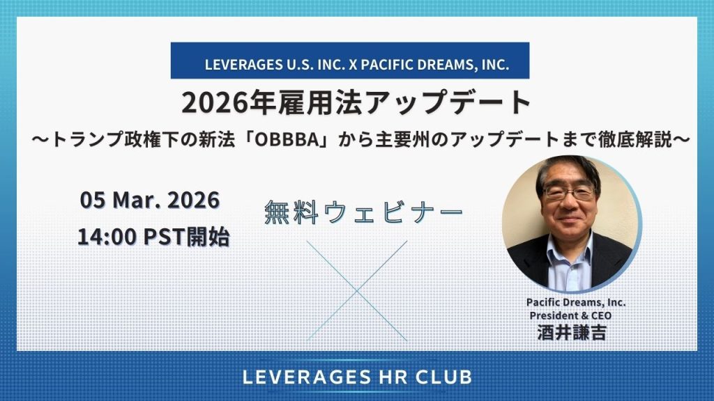 この度3/5(木)に開催されるLEVERAGES U.S. inc.様のウェビナーに弊社代表酒井が参加させていただくことになりました。本セミナーでは、OBBBAやSECURE Act 2.0、CA・NY・その他主要州の最新アップデート、さらに移民法の動向やリスクを未然に防ぐためのハンドブック改訂の実務ポイントまで、押さえるべき要点をわかりやすく解説します。ウェビナーの詳細やお申込み方法は下記よりご確認ください。