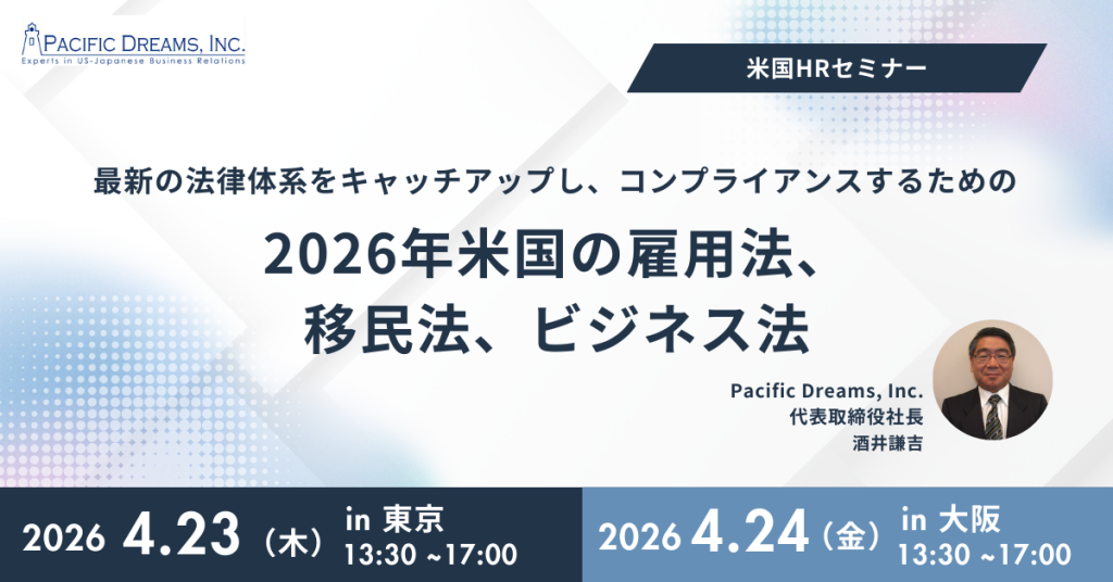 今回の米国HRセミナーでは、最新の法律体系をキャッチアップしコンプライアンスを強化するため、2026年の米国雇用法を中心に、移民法およびビジネス法に関する最新情報をお届けします。