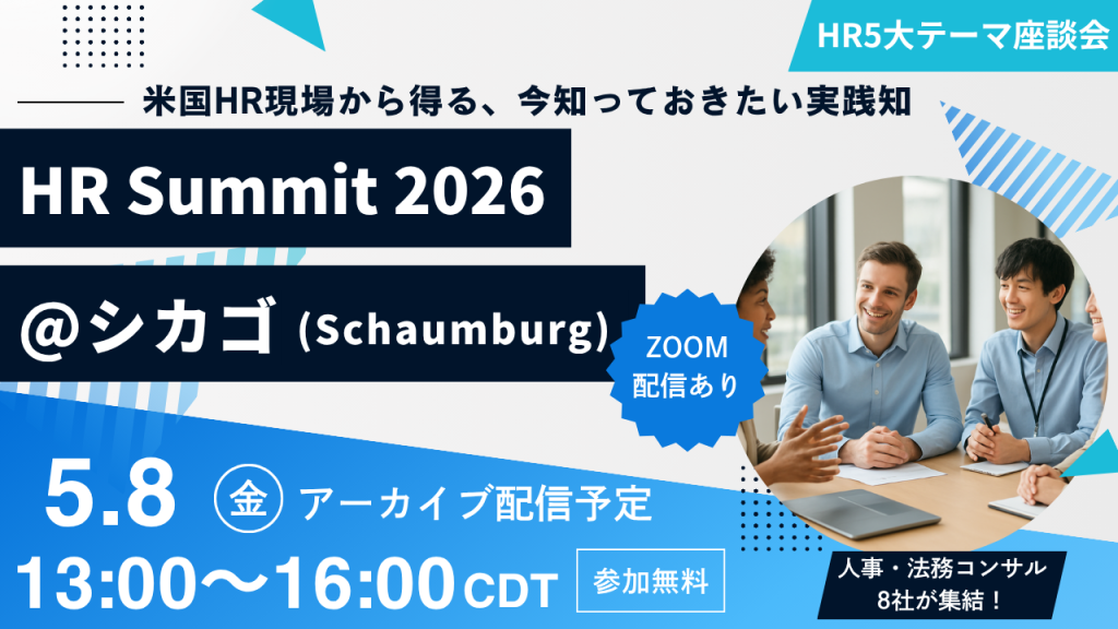 2026年5月8日(金)午後1時(アメリカ中部時間)より、イリノイ州シカゴにて弊社 Pacific Dreams, Inc. 主催となります「2026年度HRサミット」を開催いたします。2026年度のHRサミットでは、『米国HR現場から得る、今知っておきたい実践知』をテーマに掲げ、人事・法務コンサル8社が集結し、座談会形式で5つのテーマについて情報をお届けいたします。